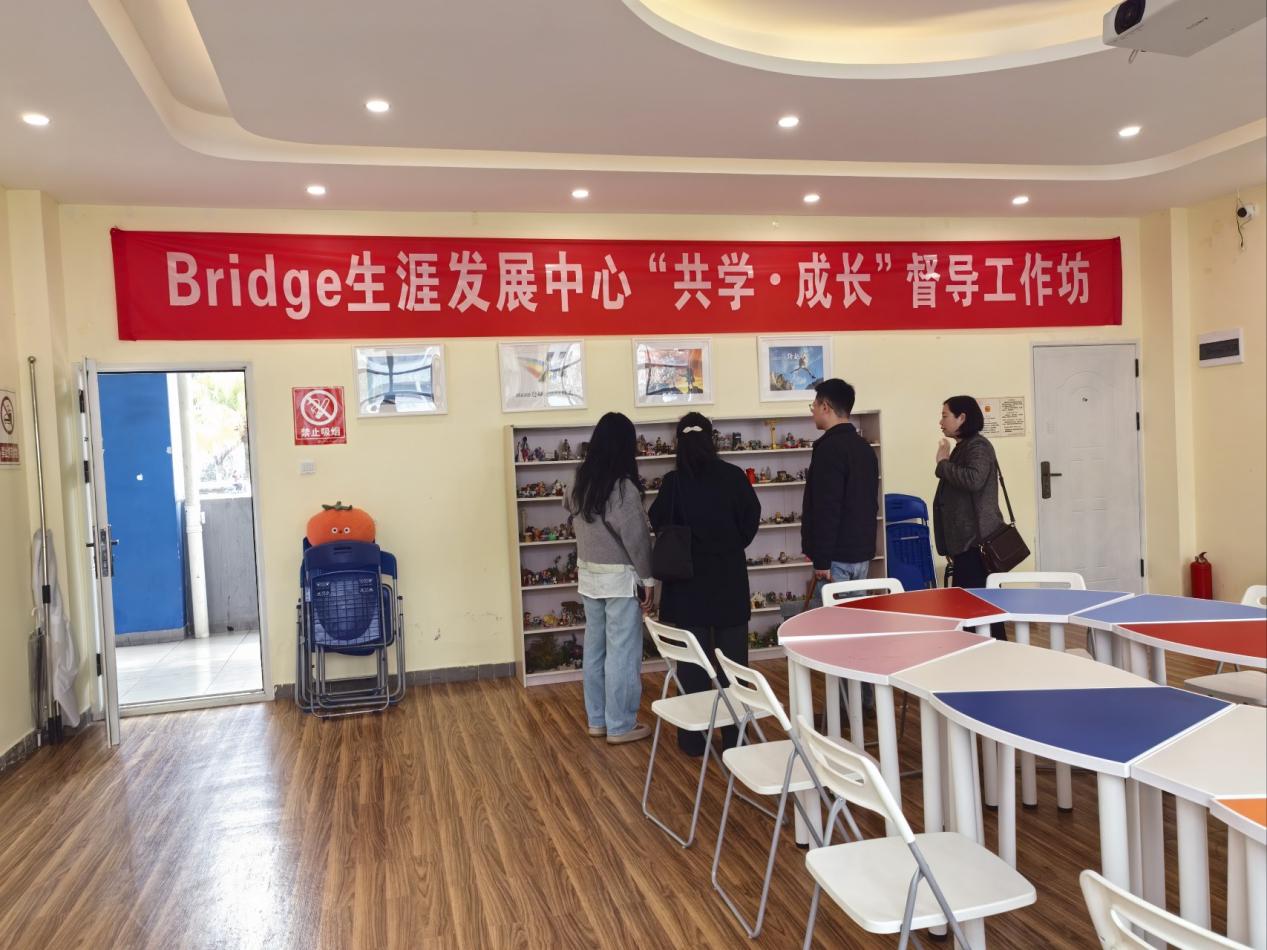 参访团实地参观了Bridge生涯发展中心场地,重点考察工作室空间布局、功能分区、设备配置、环境营造等关键环节。该中心为2023年四川省大学生职业生涯咨询特色工作室,其规范化建设、专业化运营模式及以学生为中心的服务理念,为我校生涯规划咨询室建设提供了清晰的参照范本。