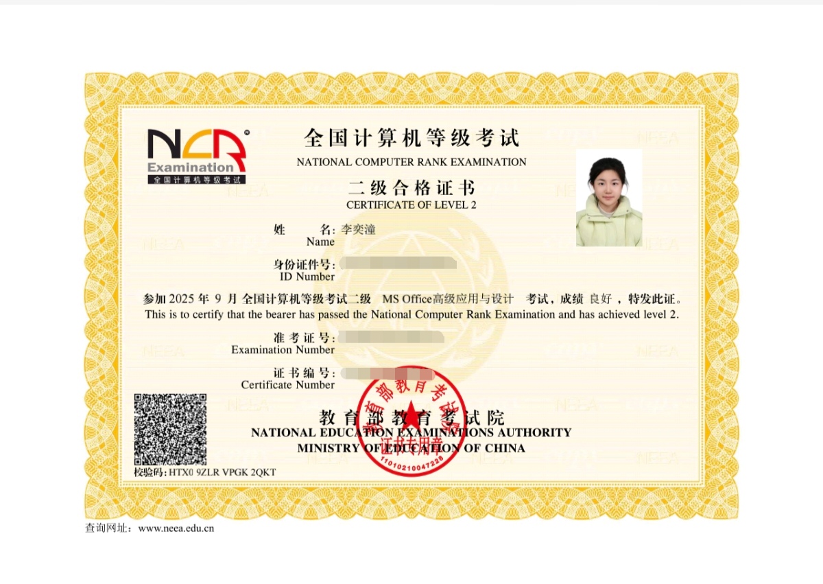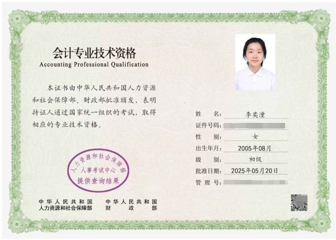 除了深耕专业课程外,李奕潼更注重综合素养的全面提升。她主动拓展学习边界,利用课余时间系统准备各类资格认证考试,成功考取大学英语四六级、普通话水平测试二级甲等、初级会计资格证及全国计算机二级证书,构建起“专业核心+通用技能”的全面知识体系。优异的学业表现与扎实的技能积累,让她顺利斩获国家奖学金、校级“三好学生”等多项荣誉,这些荣誉既是对她过往努力的肯定,更成为她持续前行的动力。