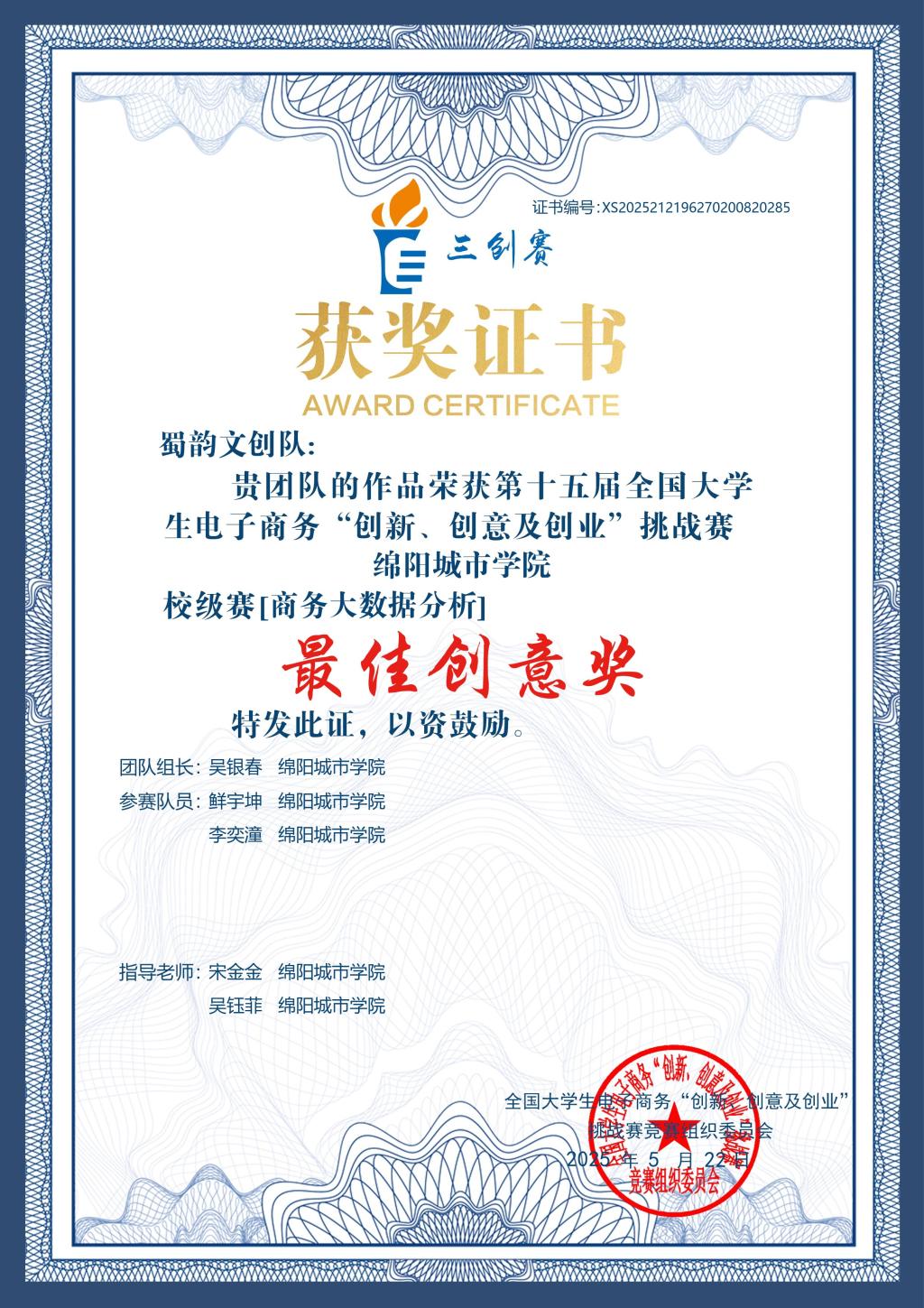 “纸上得来终觉浅,绝知此事要躬行”,李奕潼始终坚信理论学习的最终目的是指导实践。她积极投身各类学科竞赛,将课堂所学转化为解决实际问题的能力,在竞技舞台上锤炼自我、突破自我。在四川省大学生供应链优化管理大赛中,她与团队成员围绕实际供应链管理案例展开深度分析,反复梳理逻辑、优化方案,历经数十次修改完善,最终将专业知识精准转化为实践成果,斩获省级二等奖;在第十五届全国大学生电子商务“创新、创意及创业”挑战赛校赛中,她牵头梳理团队创意,完善商业模式,凭借新颖的思路和可行的方案,成功摘得“最佳创意奖”。一次次竞赛历练,不仅提升了她的创新思维、问题解决能力和团队协作能力,更生动诠释了“以赛促学、以赛促能”的成长理念。